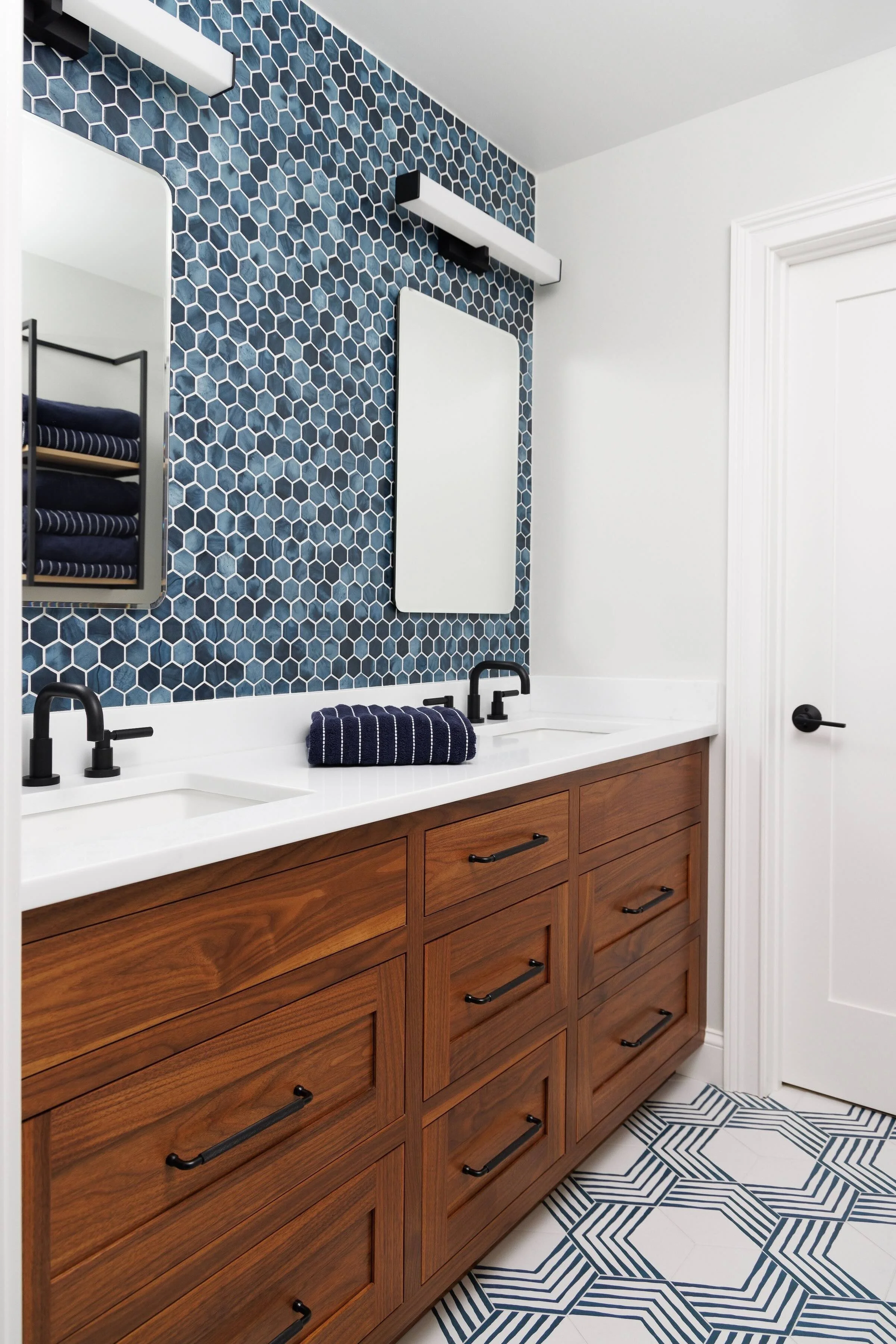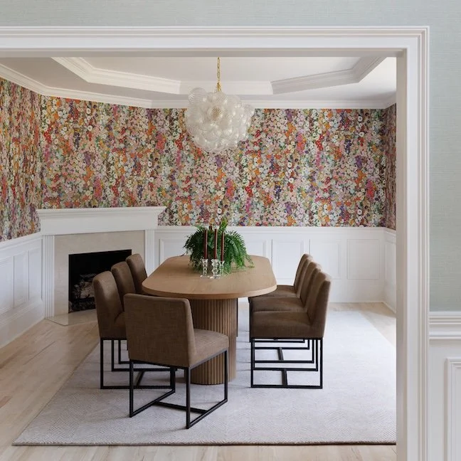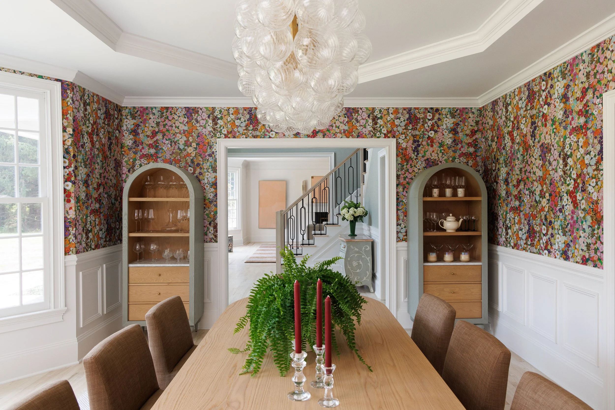 Located in Westport, Connecticut, this new project modernizes classic countryside homes with a refined use of varied meticulous selected materials. The home features a rebellious, yet sophisticated palette, from subdued greens in the kitchen to bold blues in geometric tiles in one of the secondary suite bathrooms. It blends subtle stylistic nuances with classic Connecticut design elements. The hollyhock wallpaper in the dining room is whimsical yet unforgettably timeless: balancing the clean lines of the furnishings, the simplicity of the materials and the medley of textures in the light fixtures.